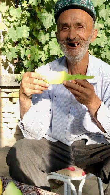 视频里,爷爷坐在院子里,手里拿着一个老汉瓜,一脸期待地准备品尝。只见他小心翼翼地切开瓜皮,露出里面金黄色的瓜肉。爷爷的脸上洋溢着幸福的笑容,仿佛在说:“这瓜,真香啊!”